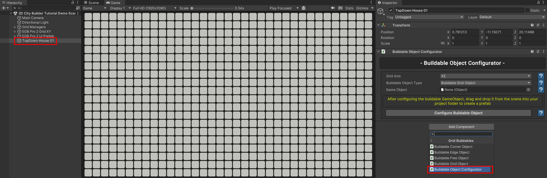 * Add the **Buildable Object Configurator** component to the newly created GameObject.