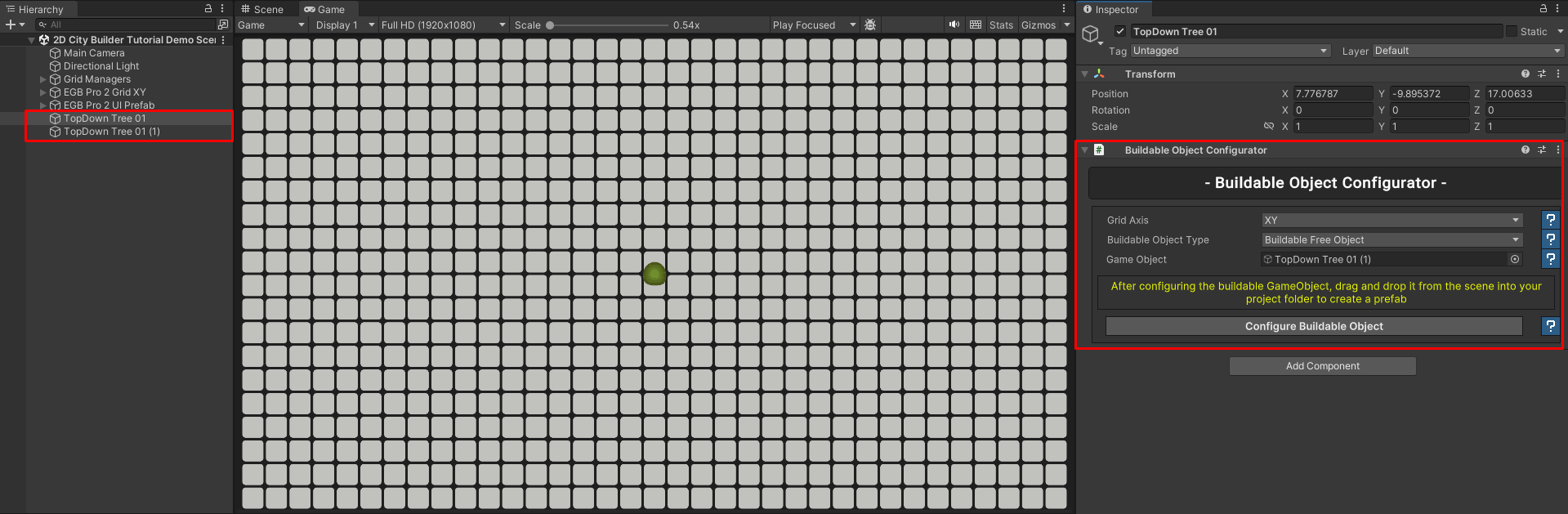 For the **TopDown Tree 01** and **TopDown Tree 02** prefabs, no changes are required. Since they use **Buildable Free Object** components, they do not occupy any grid cells and can be freely placed on the grid. Leave these two prefabs as they are.