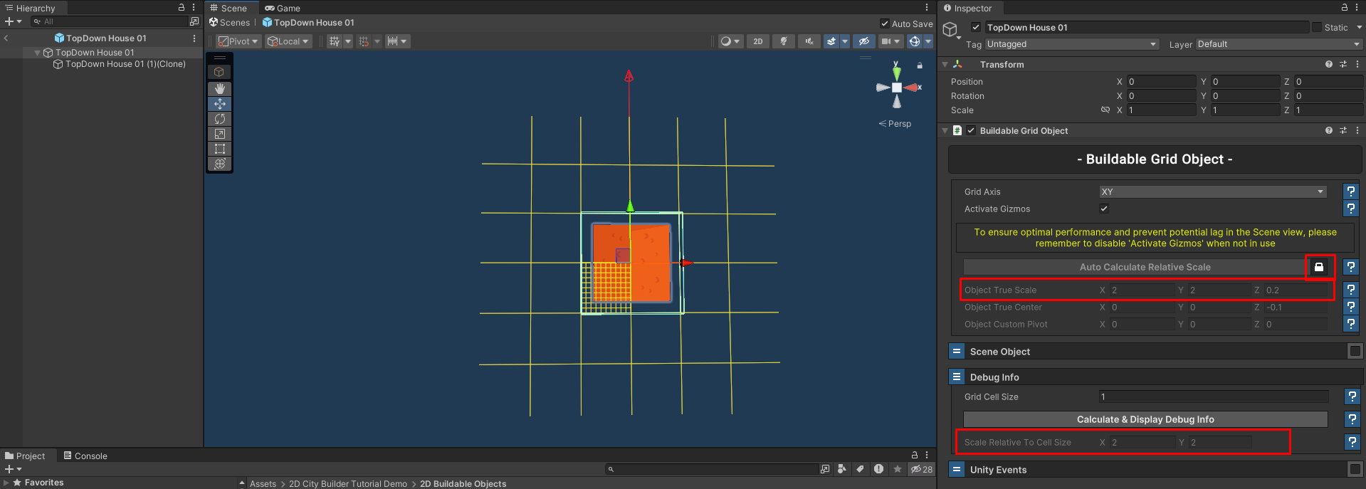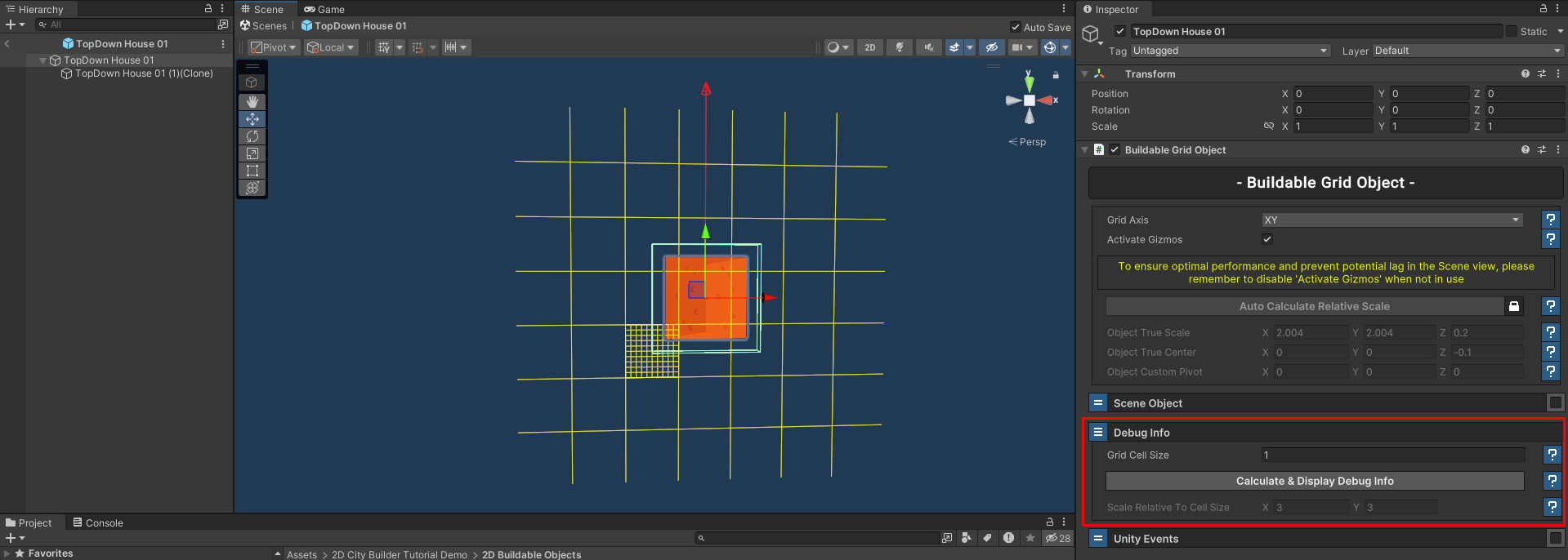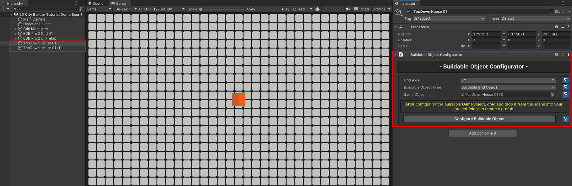 * Drag and drop the configured **TopDown House 01 Buildable Object** from the **Hierarchy** into the **2D Buildable Objects** folder. This will create a prefab for the object.