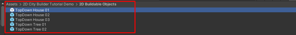 Now, create another folder inside the **2D City Builder Tutorial Demo** folder and name it **2D Buildable Objects**. This folder will store the Buildable Object Prefabs.
